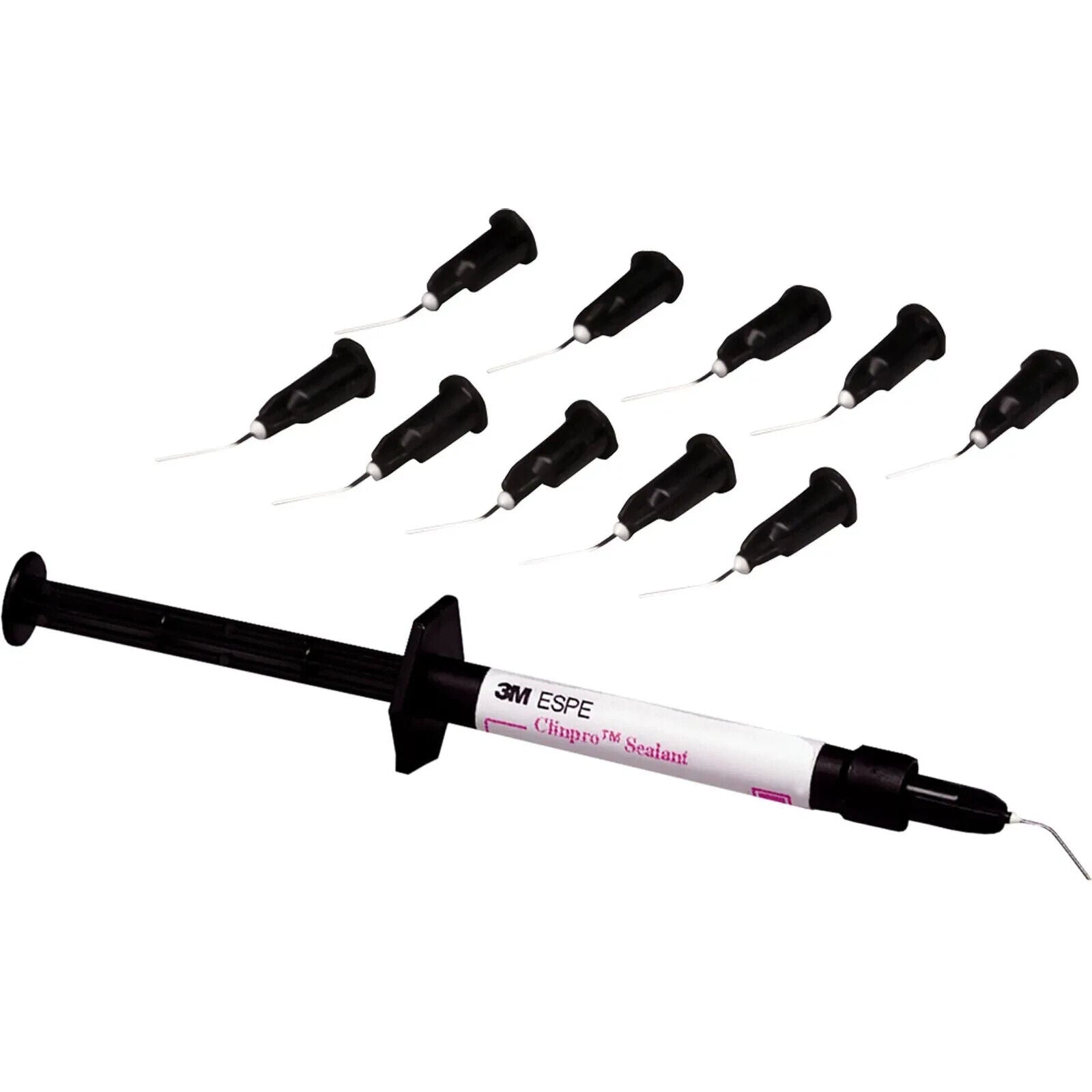 Benefits at a glance: Changes color from pink to white during light cure Unfilled: flows into pits and fissures Self-occluding: needs little or no adjustment after curing Contains fluoride Supplied in a syringe or bottle dispenser Needle-nose tip on syringe to aid in placement Clinpro Sealant is packaged in two forms: in 1.2 ml syringes with blunt needle tips for direct delivery to the tooth, and in 6 ml plastic bottles with a drop dispenser tip.