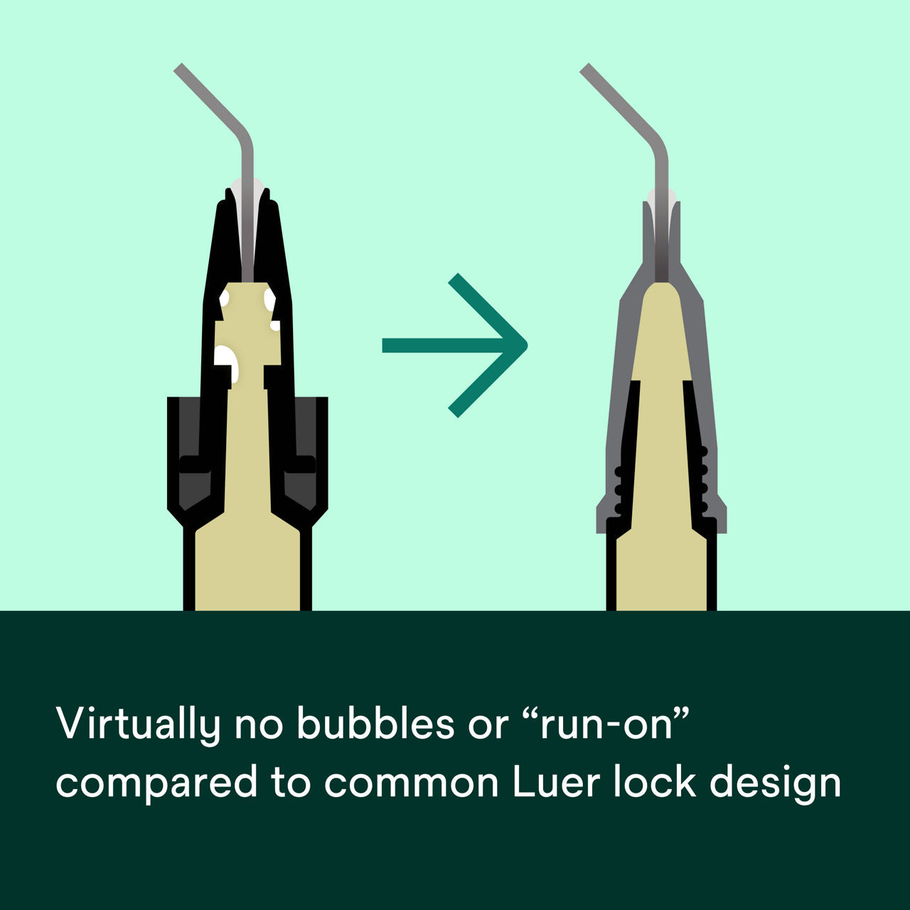 Syringe design virtually eliminates bubbles and material “run-on”.