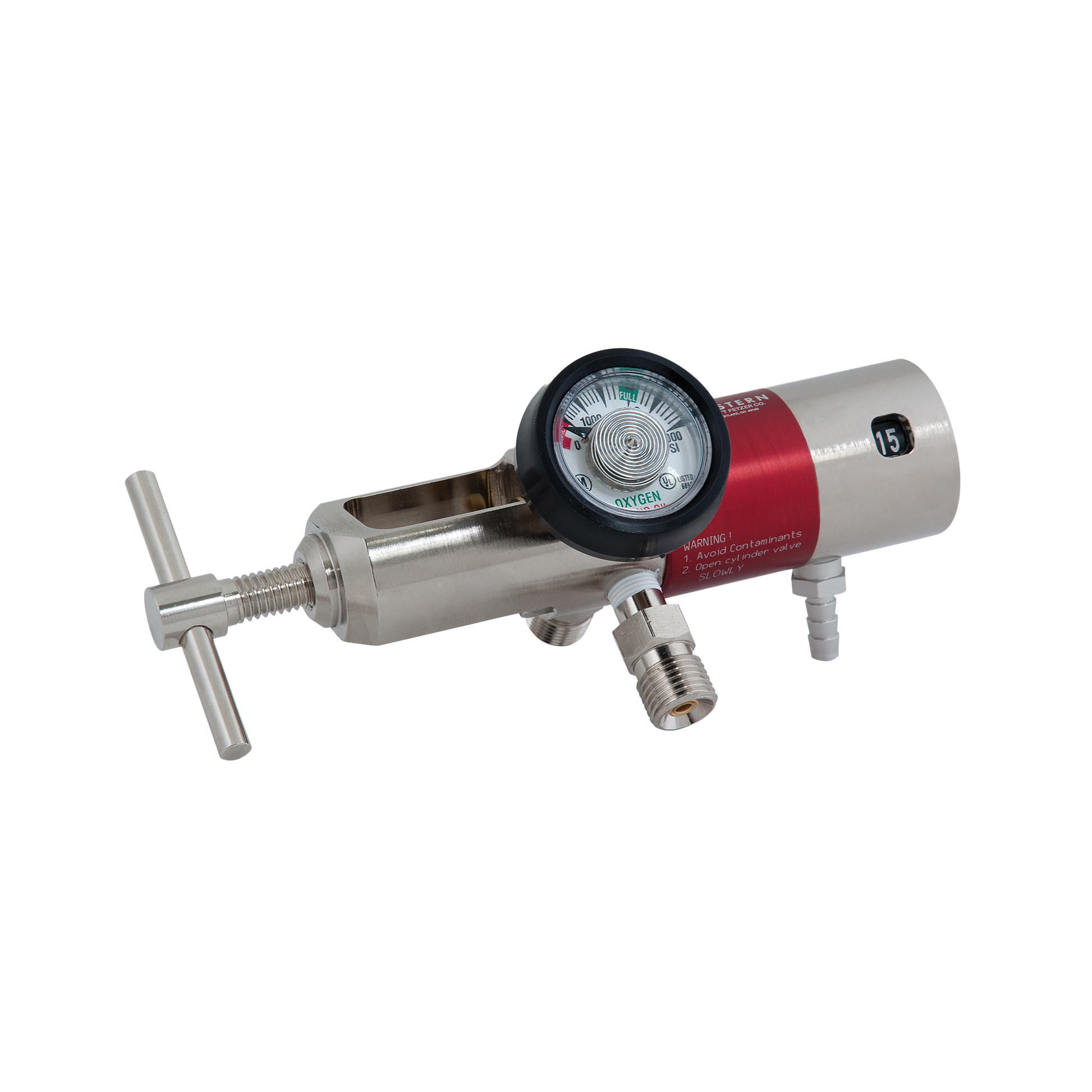 E Yoke Regulator with Adjustable Liter Flow O2 Fitting, DISS Fitting, and Cylinder Content Gauge.