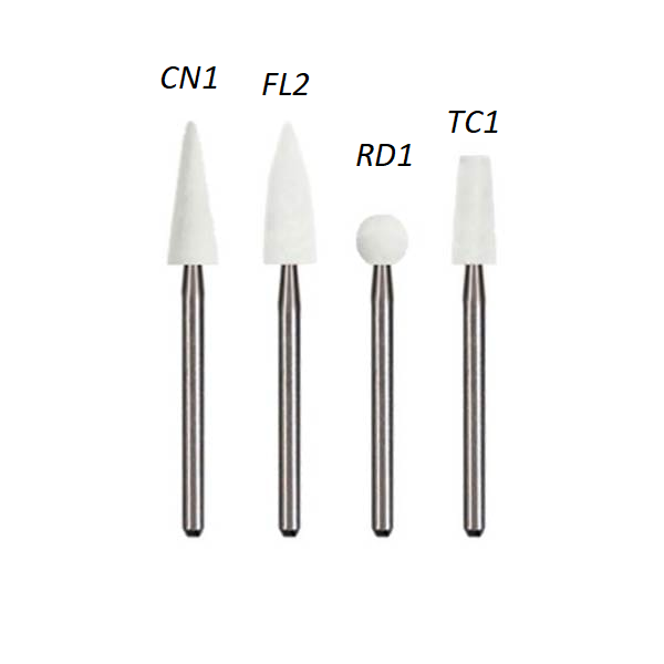 - White Stones for fine finishing on enamel, composites, glass ionomer restoratives, and porcelains