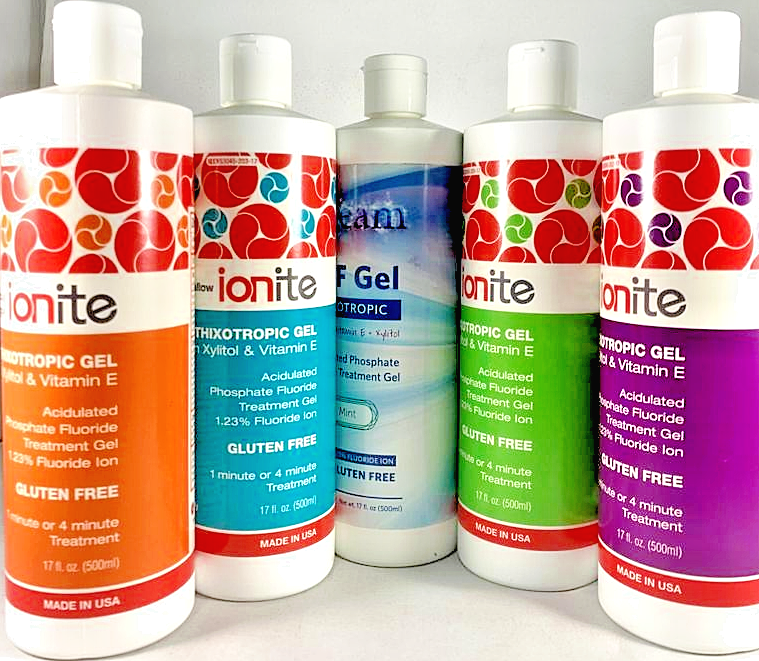 Ionite APF is a 60 second acidulated phosphate fluoride gel. It is a very reliable thixotropic gel as it flows easily during tray placement and its thick pudding consistency minimizes the risk of ingestion and assures maximum contact with all tooth surfaces. Low PH that provides maximum fluoride uptake in 60 seconds.