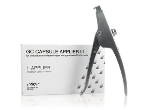 | GC CAPSULE APPLIER III Glass Ionomer Dispenser Activation Dispensing GI Capsules The GC Europe GC Capsule Applier III is used with all of GC materials in capsules. It pre-activates the capsule and dispenses the material. The Capsule Applier is designed to be used with all GC encapsulated glass ionomer products to facilitate easy dispensing of the mixed materials directly to the tooth preparation. Features and Benefits: The applier may be steam autoclaved at 121-134C (250-275F) for 3-15 minutes (excluding heat-up time) Easy to clean after use; may be cleaned using gauze soaked in alcohol Simple steps for use from capsule loading to capsule removal. Package contents: 1x GC Capsule Applier ONLY (Glass Ionomer Capsules NOT included) |
