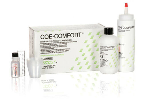 GC COE-COMFORT TISSUE CONDITIONER - 6 OZ. POWDER AND 6 OZ. LIQUID COE-COMFORT is a self-curing, chairside edentulous tissue conditioner used to restore sound form and condition to the underlying tissue. Acting as a cushion to the tissue, a lining of COE-COMFORT allows the denture-bearing tissue to recover and return to a normal, healthy condition. Features and Benefits: Mixes in 30 Seconds Can be used as a Functional Impression Material Contains Zinc Undecylenate to Minimize Odor and Fungal Growth Package contents: 1x 6 oz. Powder, 1x 6 oz. Liquid, Accessories [Professional Package] |