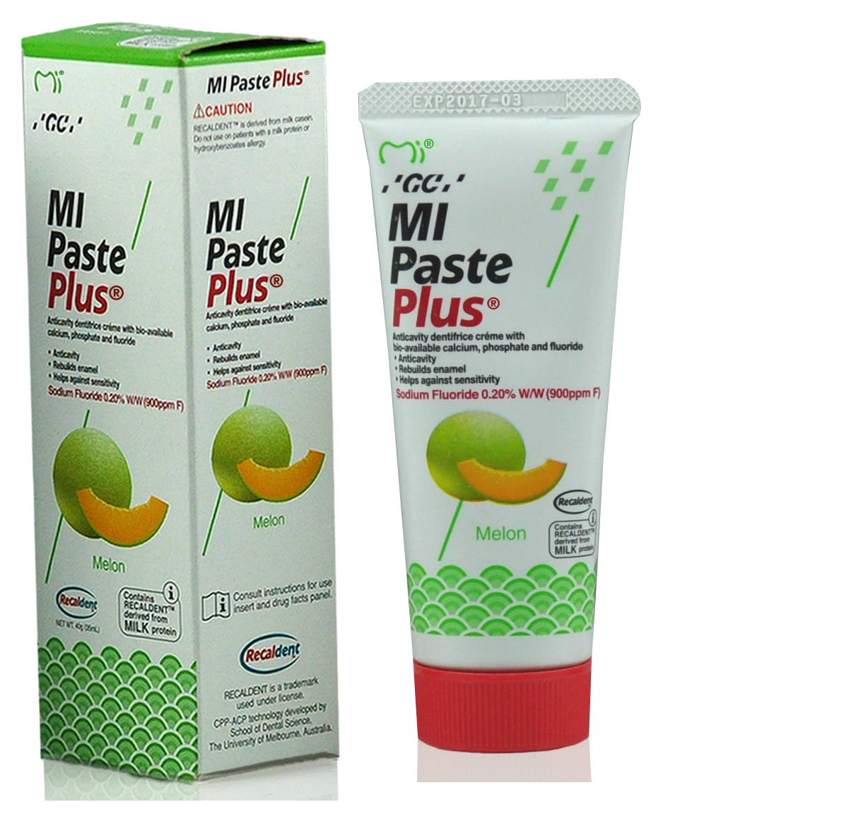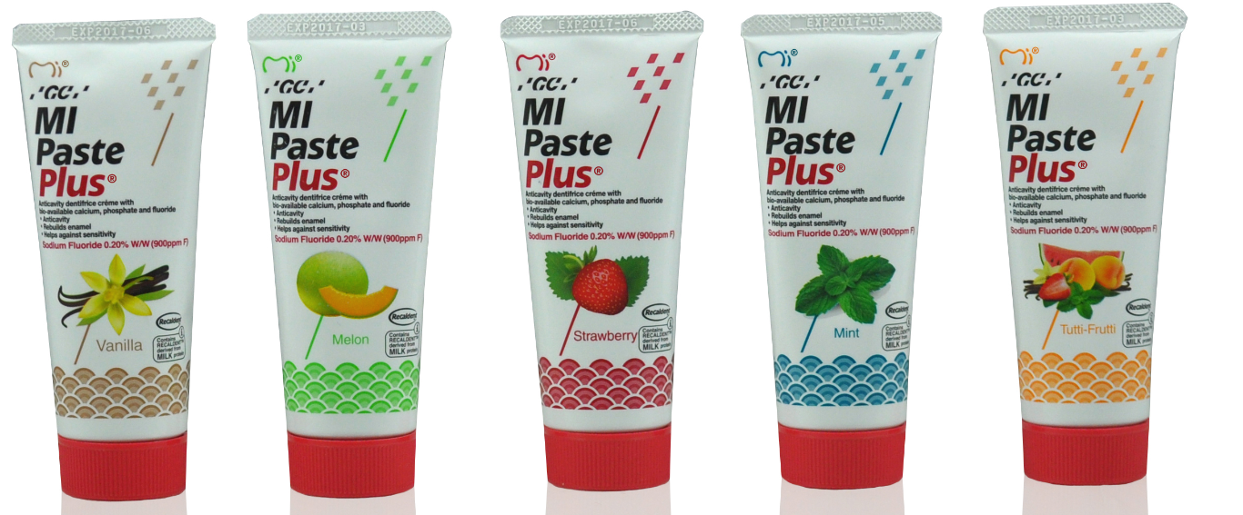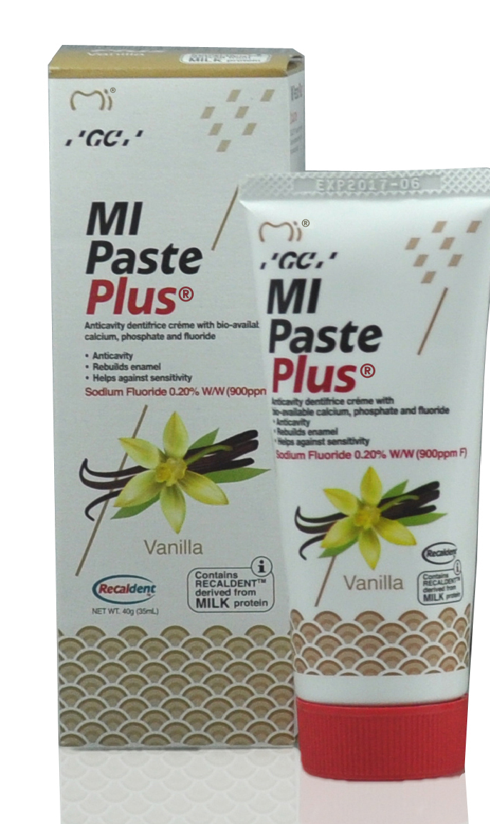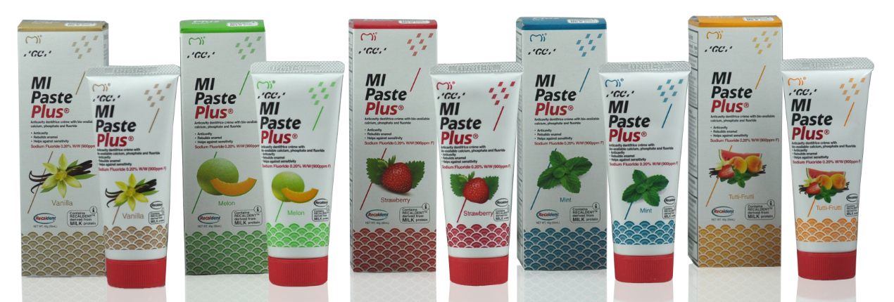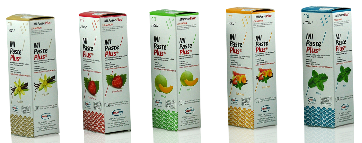 MI Paste Plus® contain RECALDENT™ (CPP-ACP); Casein Phosphopeptide (CPP) are natural occurring molecules which are able to release calcium and phosphate ions and stabilize Amorphous Calcium Phosphate (ACP), which is also the source of calcium and phosphate