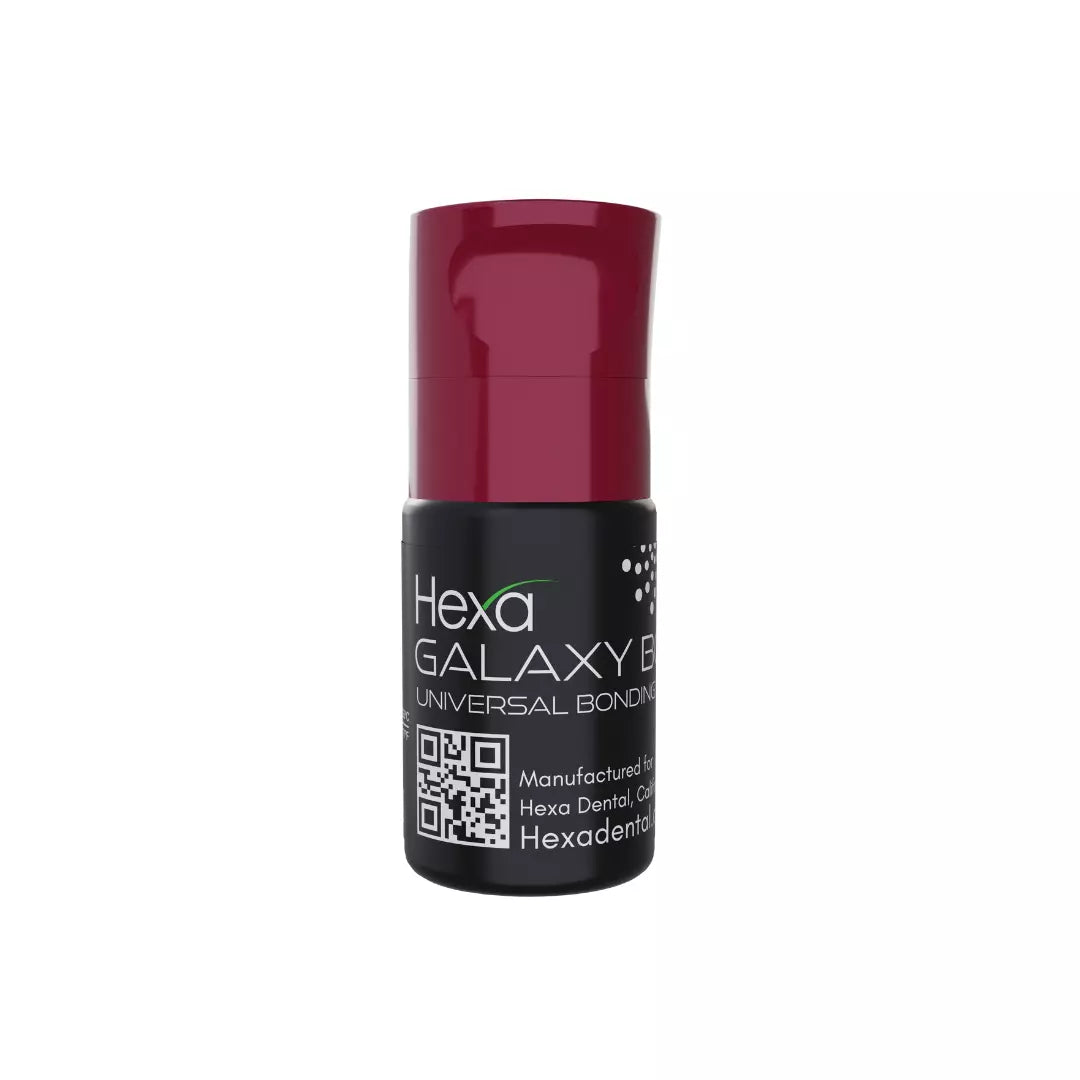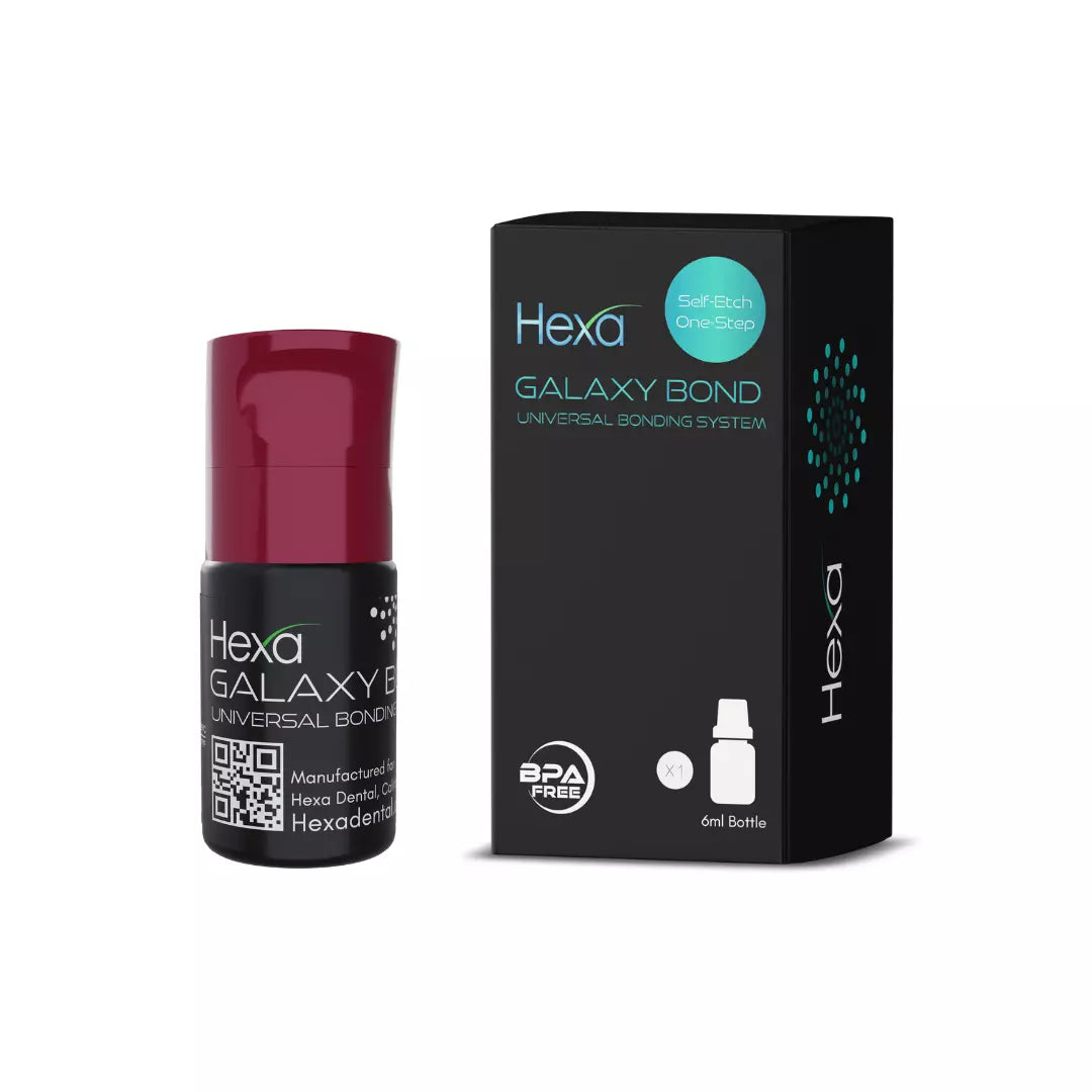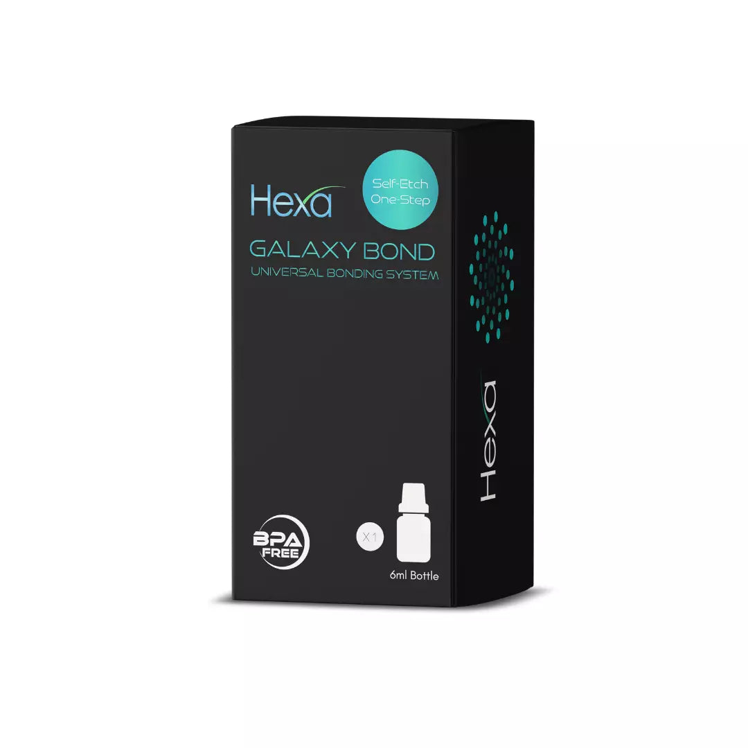 Hexa Galaxy Bond is a self-etching adhesive engineered for reliable bonding to both enamel and dentin, making it ideal for a wide range of restoration and cementation applications. Offering versatile application modes, including use as a primer for metals and ceramics, Hexa Galaxy Bond caters to various cosmetic and restorative dentistry needs—from simple repairs to intricate prosthetic work. With its superior stability and colorless formula, it’s the perfect choice for cosmetic dental practices seeking exceptional results. Achieve outstanding adhesion to diverse surfaces, including metals, ceramics, composites, and fiberglass posts, while maintaining excellent performance regardless of dentin moisture levels.