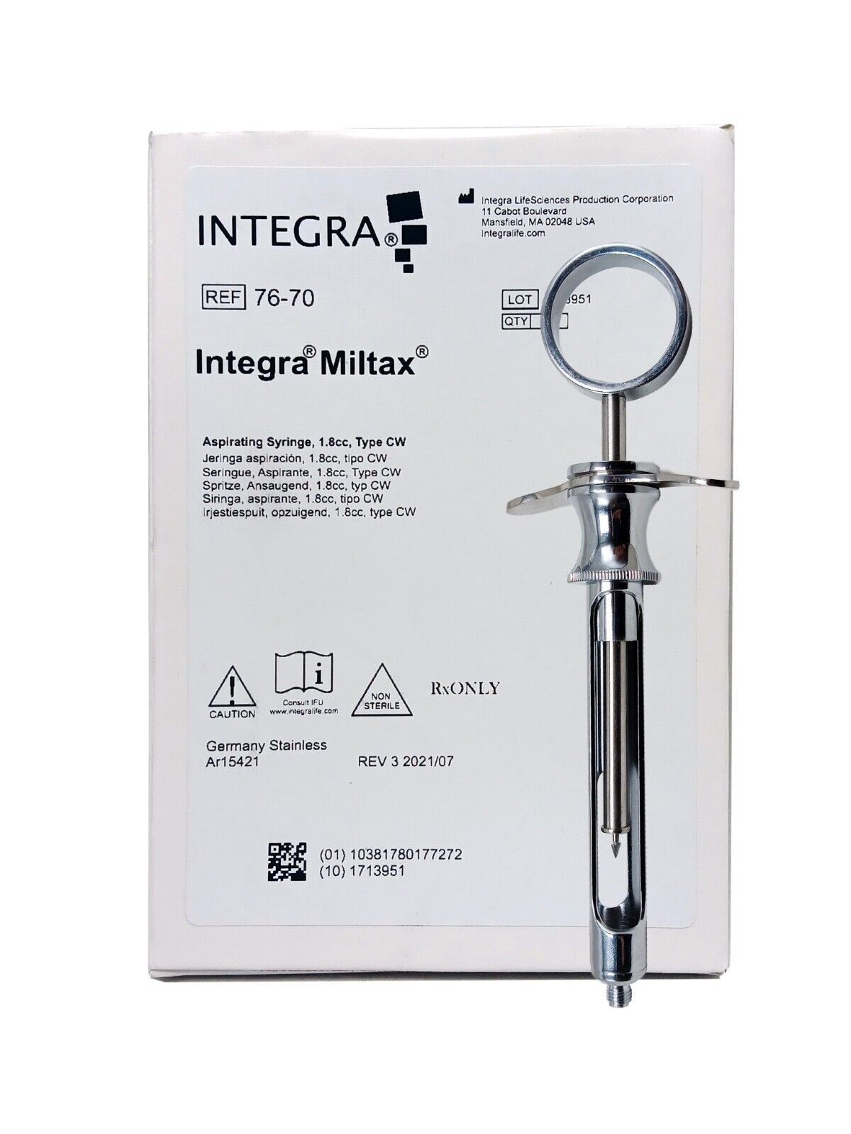 Miltex-Integra aspirating syringes have an ergonomic design allowing for precision suction, helping to remove blood and fragments of tissue and bone without obstructing access to the surgical site. These aspirating syringes are designated for the use with cartridges with solid plug. They are not compatible with hole plug cartridges.
