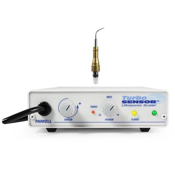 The Parkell Turbo SENSOR is an auto tune magnetostrictive ultrasonic tooth scaler that operates at either 25 KHz or 30 KHz. The Turbo SENSOR automatically detects whether the handpiece contains a 25 KHz or 30 KHz insert, and switches to the correct operating frequency. The Turbo SENSOR has an expanded low-power range to improve patient comfort during debridement, and a power boosting, user-controlled Turbo feature to increase scaling power when needed for heavy deposits. The unit functions with compatible inserts (available separately) manufactured by