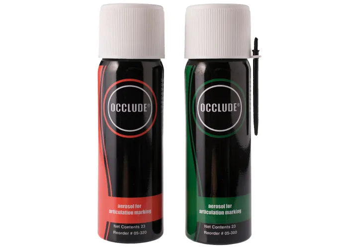 Occlude is an Aerosol Indicator Marking Spray that is approved for intraoral use and excellent for lab use. It is also an aid in seating castings. The low pressure formula provides cleaner application and is easily removed with water.