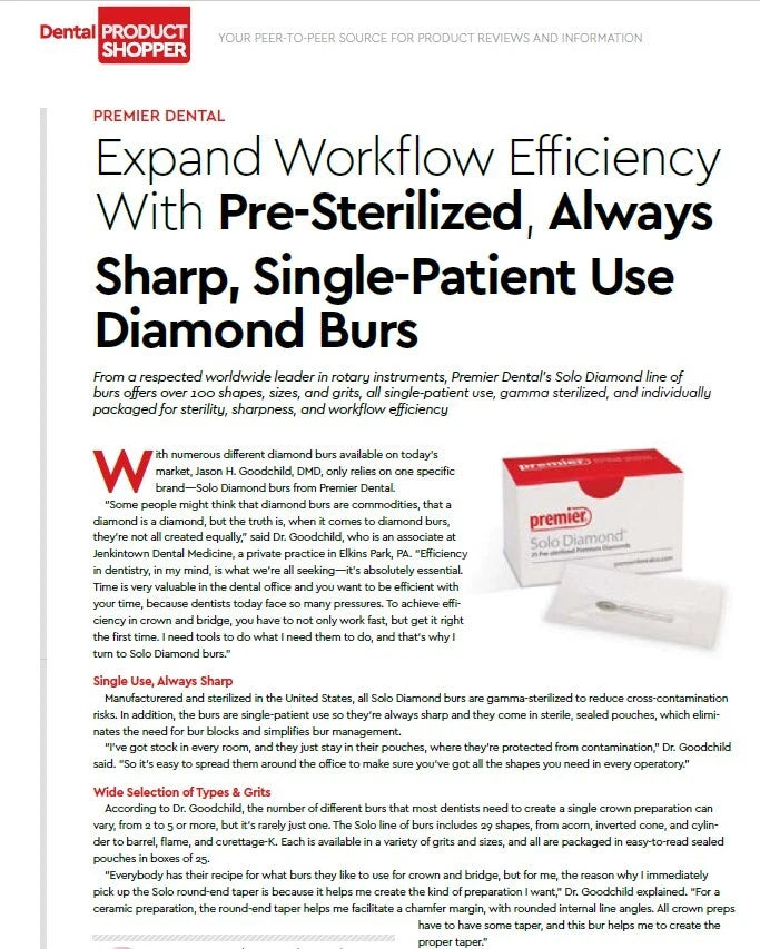 Always sharp, Solo diamonds are engineered to provide a superior cut. And because each Solo Diamond® is pre-sterilized, you’re ready to go right out of the package. That means ideal workflow efficiency. Every patient. Every time.