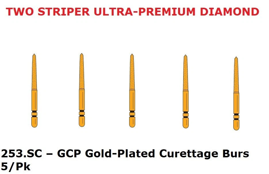 Premier Dental Two Striper Ultra-Premium Diamond 253.SC – GCP Gold-Plated Curettage Medium grit Burs (5/Pk)