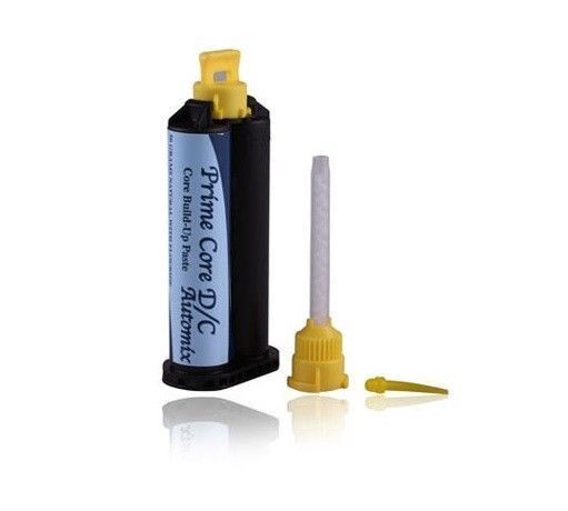 A composite based core material designed for the easy fabrication of core build-ups. The core material is a dual cure, fluoride releasing resin core material. Dispensed with an applicator gun and auto mixed in mixing cannulas providing a consistent, homogeneous mix. Intra oral application tips are provided for précised direct placement of core material. The core material releases fluoride to help reduce secondary caries. Dual curing and quick setting eliminating time consuming layering of material and allowing for easy bulk fill. Highly radiopaque and exhibits a short setting time without heat generation.