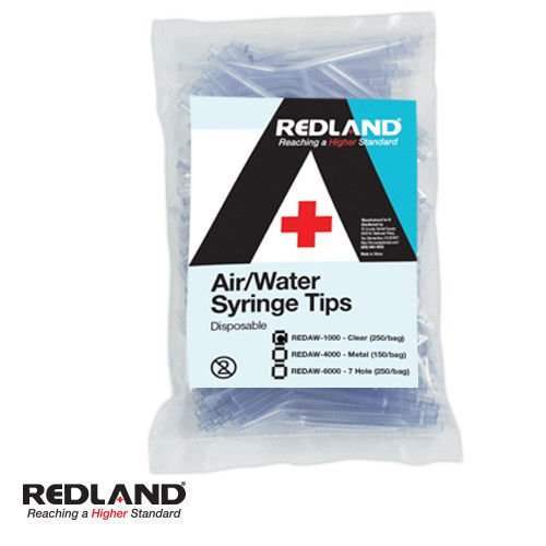 Redland Dental Products Plastic Air Water 3-Way Syringe Tips are cost effective and an excellent alternative to typical metal autoclavable tips. The disposable tips have an inner core water chamber that seats into the syringe, eliminating water contamination in the air chamber. The unique quad core design ensures instant dry air, prevents cross contamination, and delivers superior air/water spray.