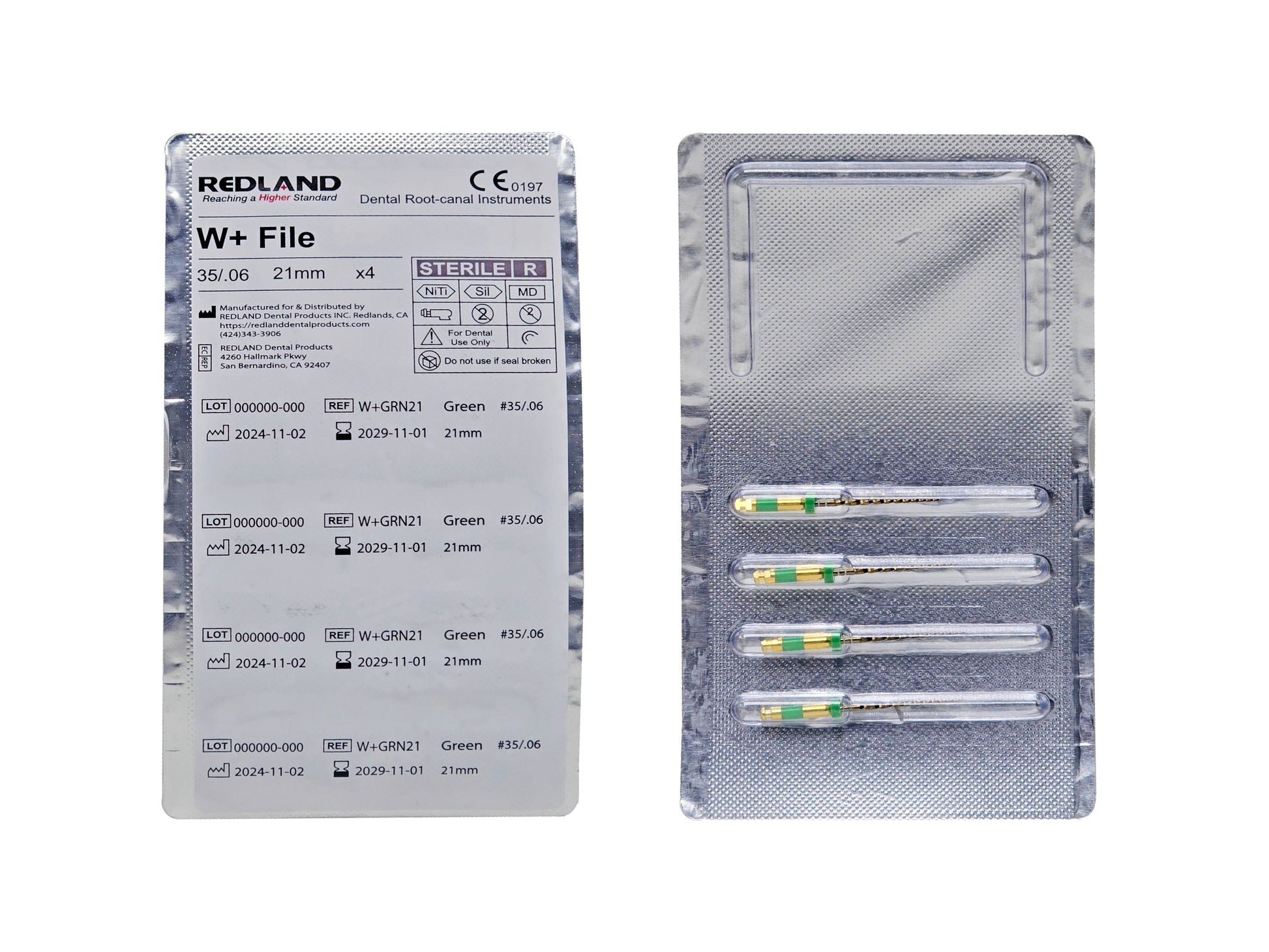 There are 4 W+ files available in various lengths to more effectively address a wider range of endodontic anatomy compared to its WaveOne predecessor. The 4 files are termed Yellow 20/.07, Red 25/.07, Green 35/.06, and White 45/.05. The 21/06 file has a fixed taper of 6% over its active portion. Each file has a fixed taper from D1-D3, yet a progressively decreasing percentage tapered design from D4-D16, which serves to preserve dentin. For example, the Primary file has diameters of 0.85 mm and 1.0 mm at D9 and D12, respectively, or the length this file typically extends below the orifice during canal preparation. Fortuitously, the Red 25/.07 file is generally the only file required to fully shape virtually any given canal.