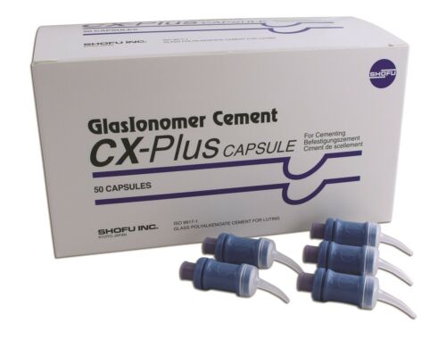 | SHOFU CX-Plus GlasIonomer Cement 50 Capsules/Pack -FDA CX-Plus Capsules are designed to save time and provide superior handling. Indicated for cementing crowns, inlays, long span bridges, and orthodontic appliances, CX-Plus has a high compressive strength, low film thickness, and is radiopaque. It is resistant to water contamination and can exist in a moist environment. Features and Benefits: Low film thickness at 15 microns Radiopacity at 1.55 mm High fluoride release Optimizes marginal integrity 0.53 g per capsule Package contents: 50 Capsules/Pack |