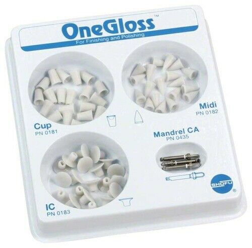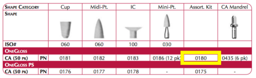 OneGloss aluminum oxide polishers are disposable • OneGloss complete kit with stainless steel CA mandrels • OneGloss PS aluminum oxide polishers are mounted on sturdy plastic mandrels • OneGloss PS are disposable & individually wrapped • Available in three different shapes • Durable enough to withstand polishing an entire arch • Use OneGloss & OneGloss PS for: composites, temporary crowns, removal of orthodontic cements & removal of stains from enamel