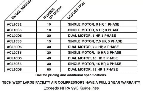 Tech West large facility air compressors lead the industry in design, quality and performance providing clean, oil free, dry air to the dental office. Compressors have energy efficient motors, totally enclosed OSHA approved fan guard, magnetic motor starters with overload protection, discharge air coalescing filters and regulator. The large facility compressors come with refrigerant air dryers. All compressors are wired for 24V remote switching and are ready for installation. Tech West will provide technical assistance with plumbing and electrical needs upon request.