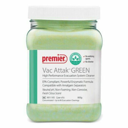 | Vac Attak GREEN High Performance Evacuation System Cleaner 800gm Jar Premier USA (Neutral pH) Safe, Effective and EPA-Compliant Evacuation System Cleaner New Vac Attak™ GREEN is a high-performance evacuation system cleaner designed to comply with the EPA’s Clean Water Act. Using powerful enzymes that get the job done, Vac Attak GREEN’s environmentally-friendly formula meets the ADA’s best management practices. With a neutral pH, its non-foaming and non-corrosive formula has no chlorine or oxidizing agents. Safe and gentle for every day use with all amalgam separators, this evacuation system cleaner is still Vac Attak-tough to clean your lines of bio-burden, prophy paste and fluoride gels. Features and Benefits: Fast-acting organic chlorine formula facilitates the immediate breakdown of protein chains, found in bio-burden, into water-soluble amino acids. Safe and environmentally friendly, non-corrosive to metals. Vac Attak is non-foaming and safe for use with all pumps. Prevents scale build-up in pumps that otherwise forms when using hard water. (Powerful enzymatic, EPA-compliant cleaner) Economical and easy to use, one scoop of concentrated Vac Attak dissolves quickly into 32oz (0.95L) of warm water and then is flushed through the system. It’s that easy! Up to 100 cleanings per 800g jar. Fresh Citrus scent. Compatible with amalgam separators • pH neutral • No chlorine • No oxidizing agents • Non-foaming • Non-corrosive Package content: 1x 800g Jar (Vac Attak GREEN) |