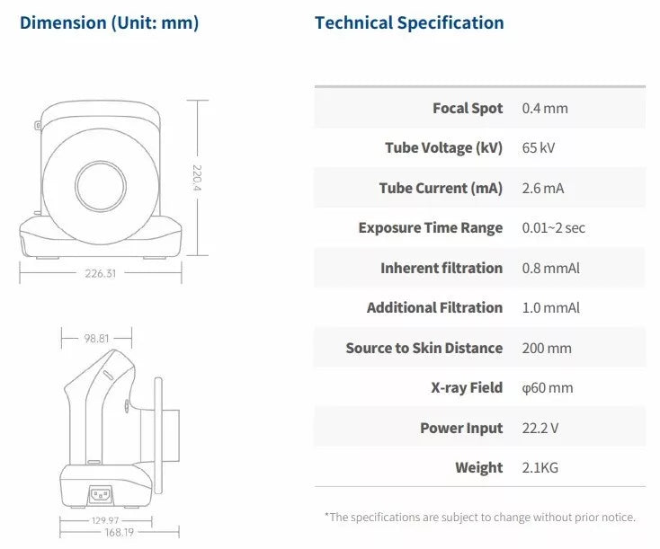 The voltage and current of 65Kv and 2.6mA generate more power to penetrate the teeth and obtain clear images. The focal spot size of 0.4mm significantly focuses more x-rays on the target teeth and produces a higher quality image on film or sensor.