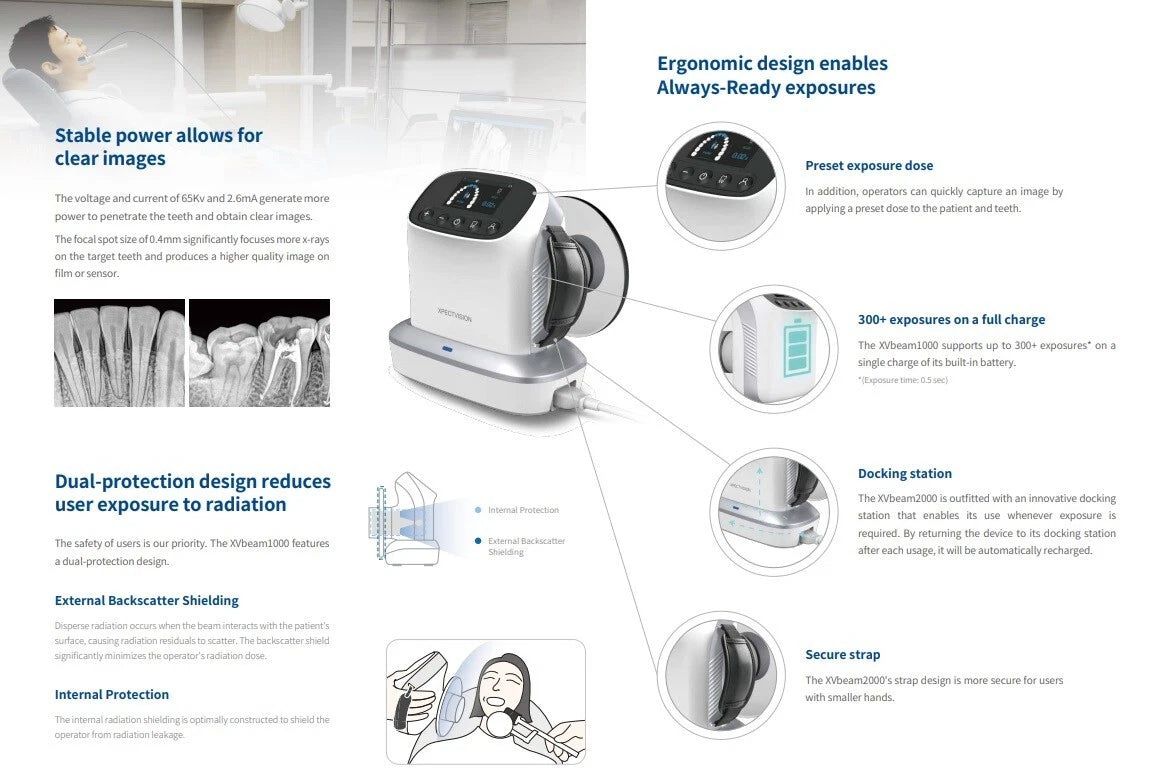 - 300+ exposures on a full charge: The XVbeam1000 supports up to 300+ exposures* on a single charge of its built-in battery